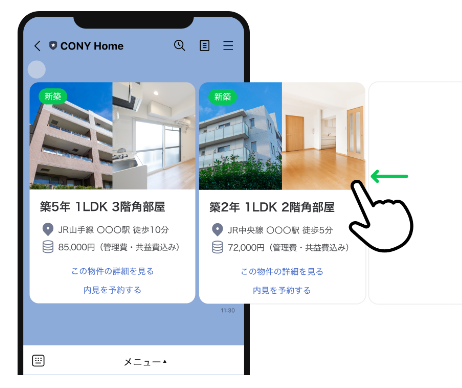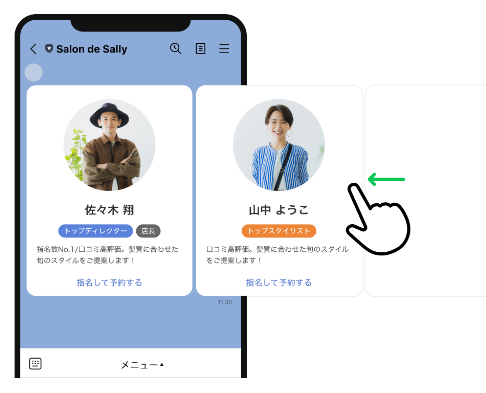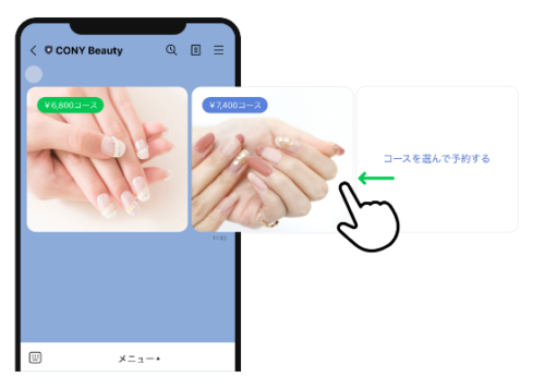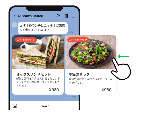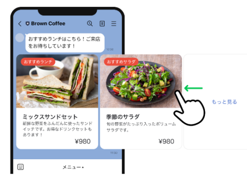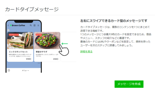 複数の画像を並べて表示し、横にスライドしながらユーザーに見てもらえるのがカードタイプメッセージです。文章だけよりも見栄えがよく読み飛ばされにくいので、ぜひ活用してください。