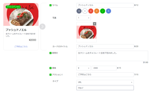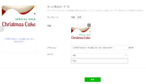 ケーキ屋さんがクリスマスケーキの予約の案内をカードタイプメッセージで作ってみたという体で設定しました。